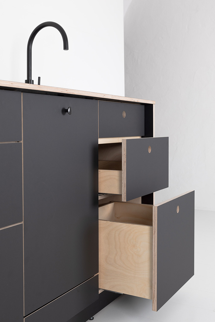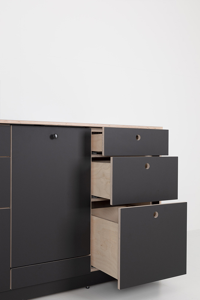 Ihr innovativer Aufbau basiert auf einer tragenden Basis, in die einzelne Schrankmodule mühelos eingeklinkt werden können, abgeschlossen von einer durchgängigen Arbeitsplatte. Diese intelligente Konstruktion macht EVA zu einem wahren Verwandlungskünstler im Alltag – leicht auf- und abbaubar, immer wieder neu konfigurierbar und frei im Raum positionierbar.